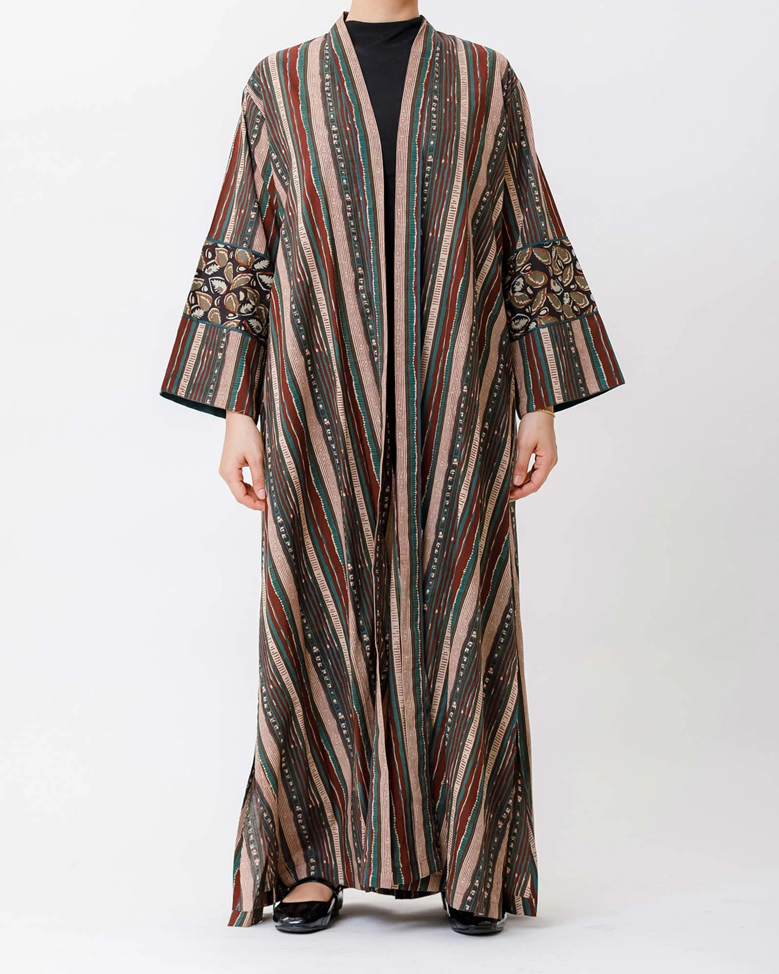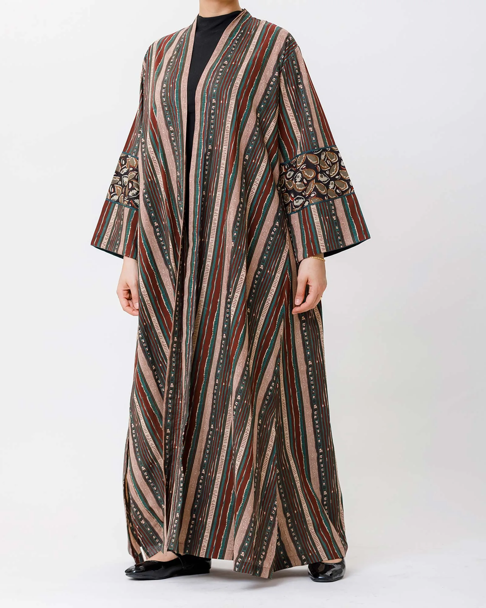 Bring effortless charm to your wardrobe with Annie, a striped cotton abaya designed in a relaxed A-line cut. Detailed with patchwork sleeves and piping accents.