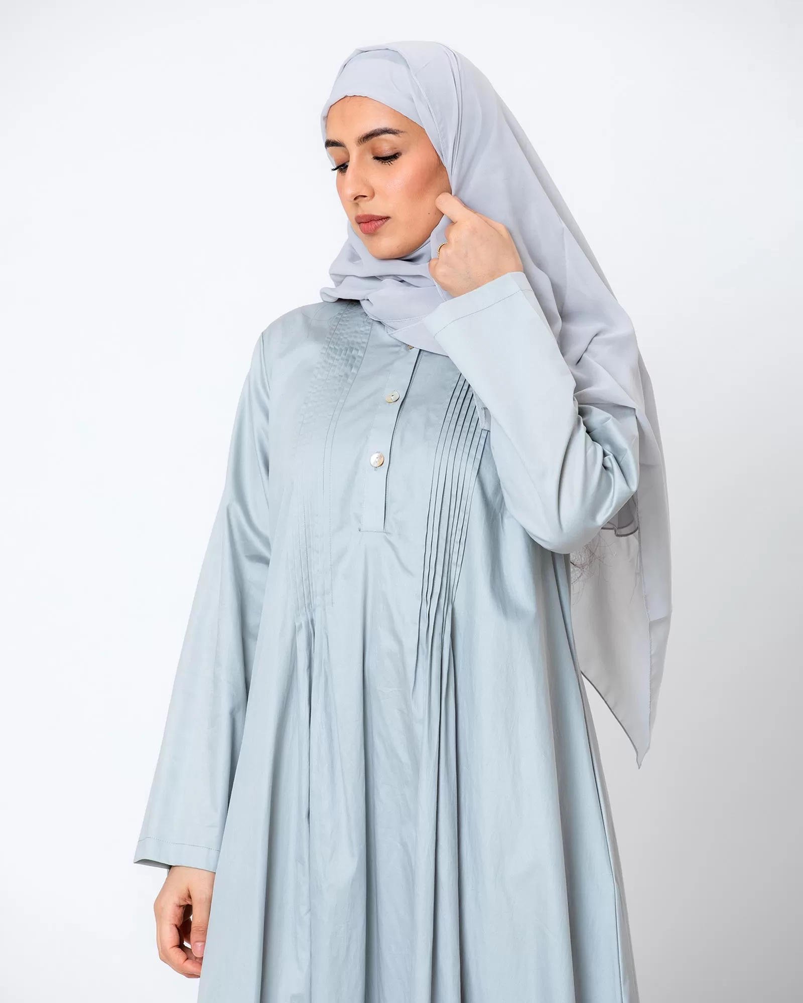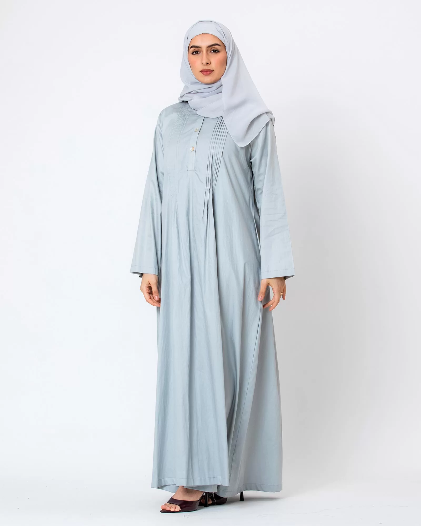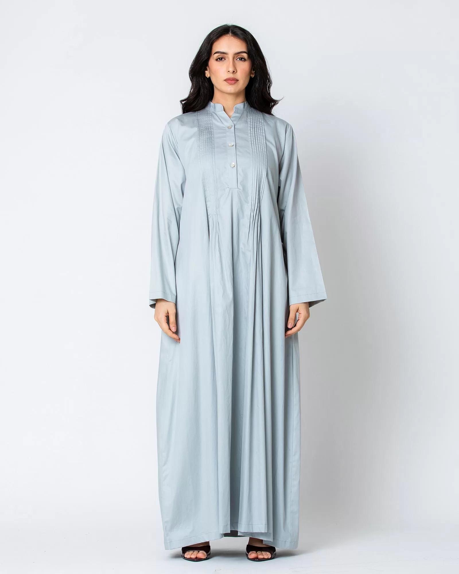 • Crafted from soft, breathable cotton fabric, the Blossom Hajj dress is ideal for sacred rituals, daily prayers, and modest everyday wear. With its A-line silhouette, pleated bodice, and front button fastening, it offers both comfort and structure. The mandarin collar adds a refined touch, while side pockets bring practicality to the design.
