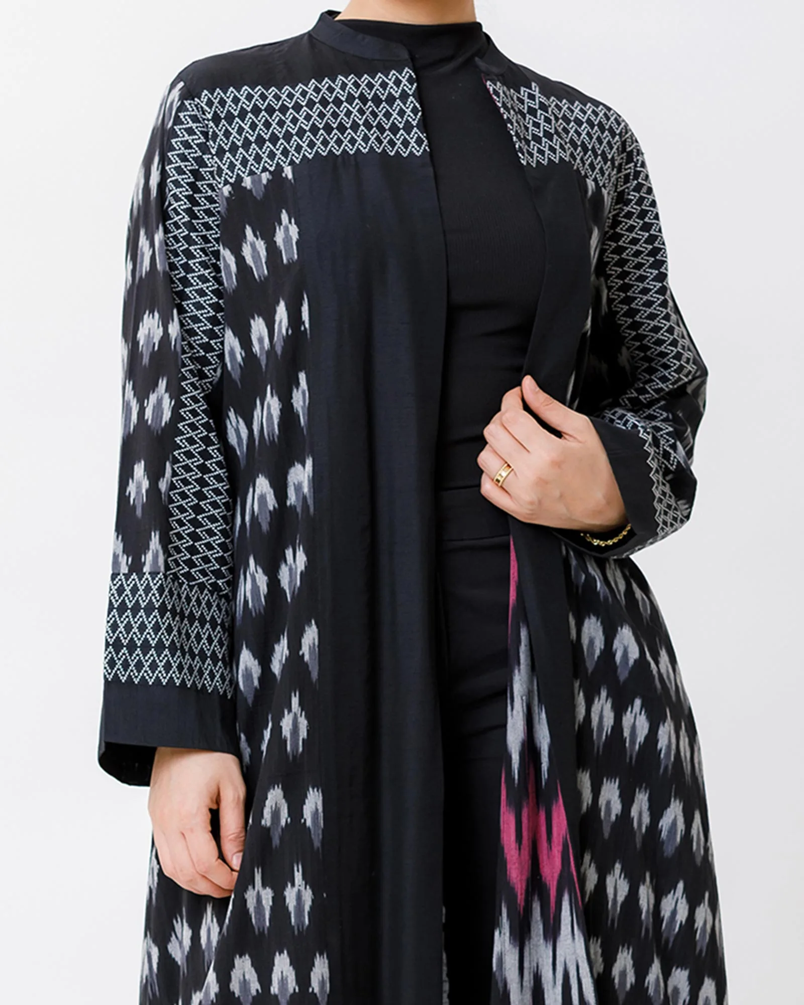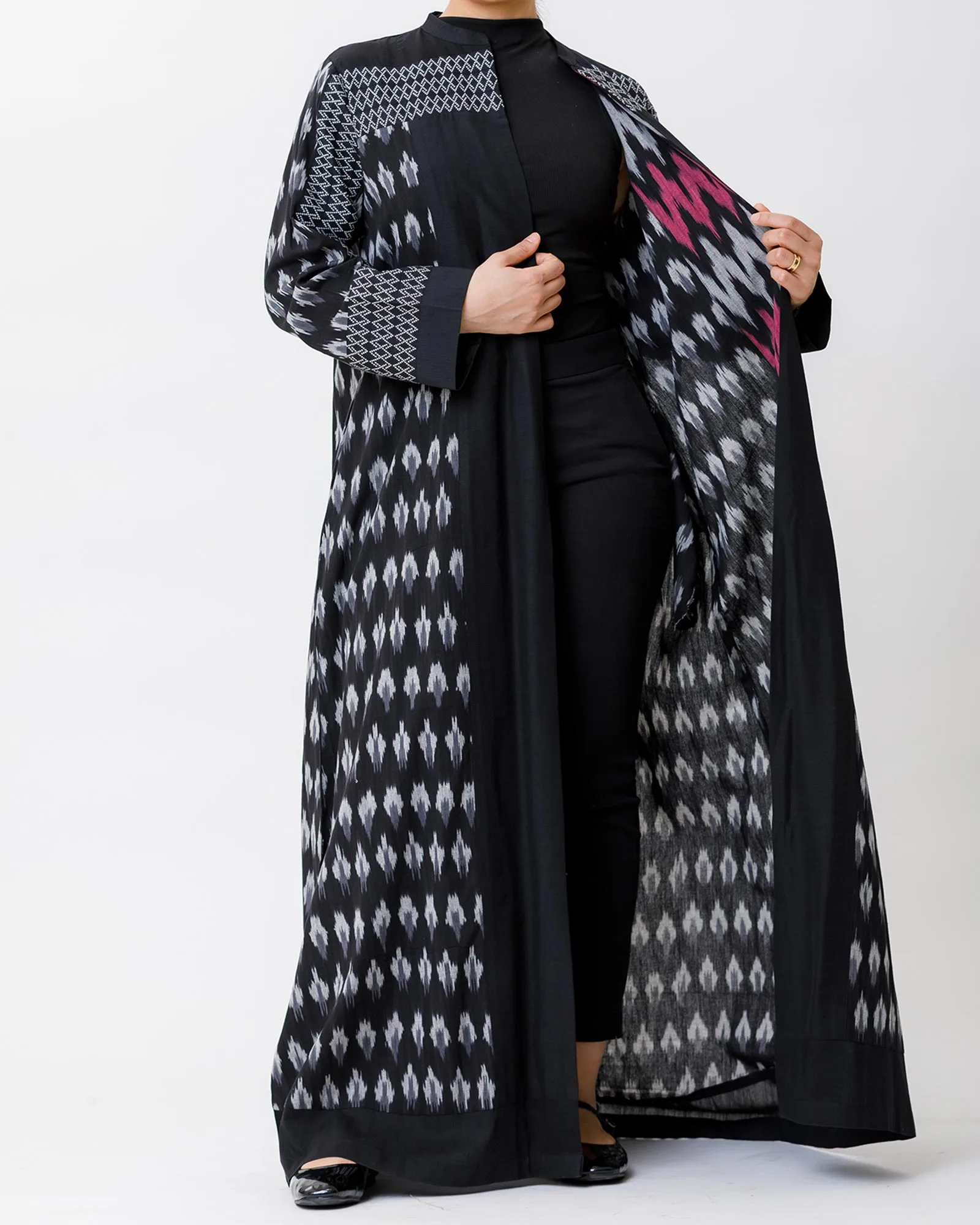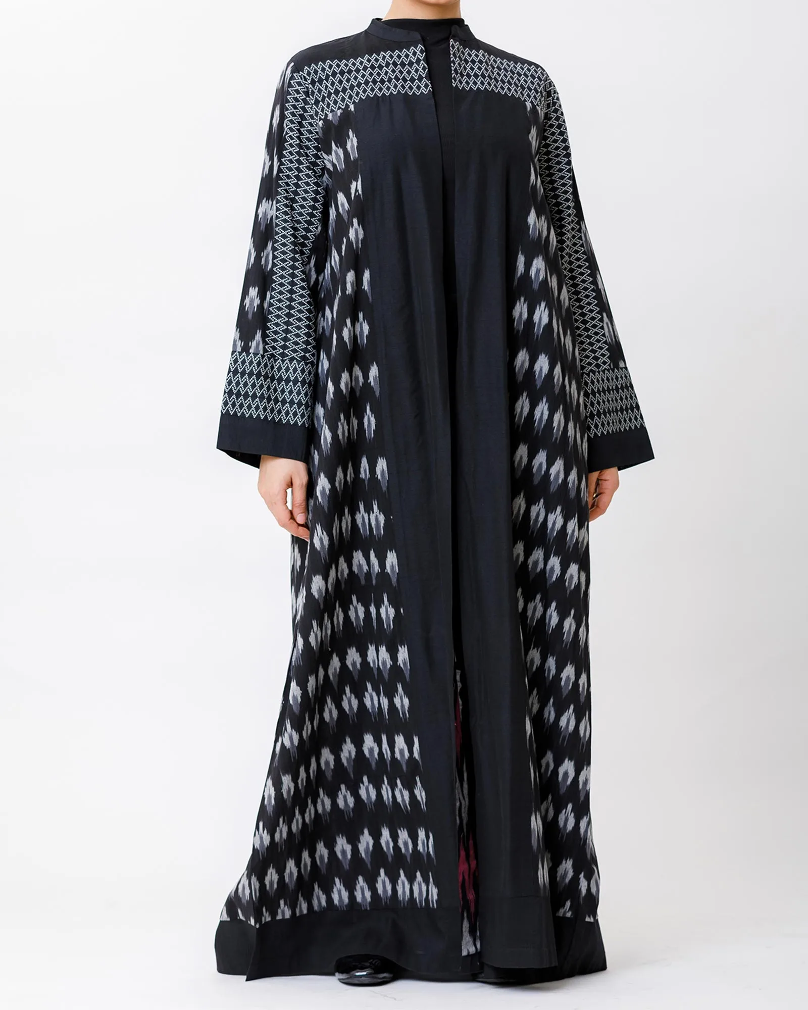 Discover Dora, a mixed cotton and linen abaya that showcases exquisite patchwork craftsmanship. With its refined tailoring and blend of rich textures, it’s a modern piece that balances artistry and elegance.