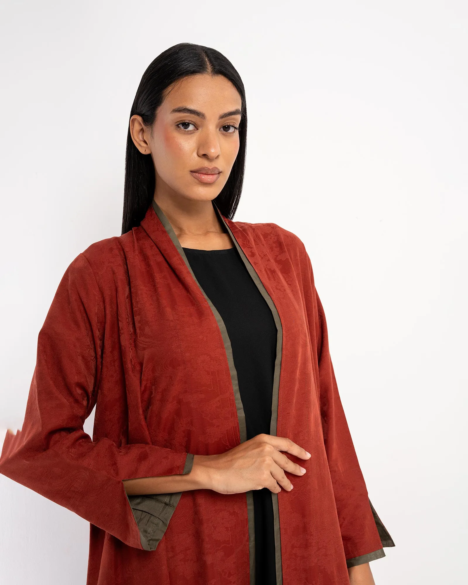 Radiate elegance with Faye 3.0, a viscose-linen blend abaya adorned with a woven floral pattern. Designed in a flared A-line cut with contrasting piping, it captures the essence of modern sophistication and timeless grace.