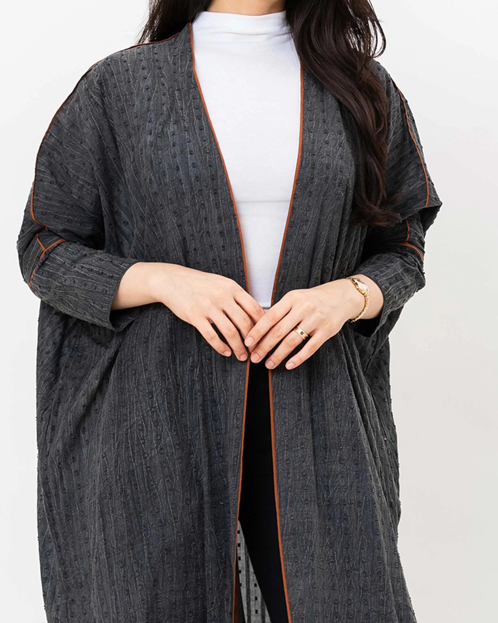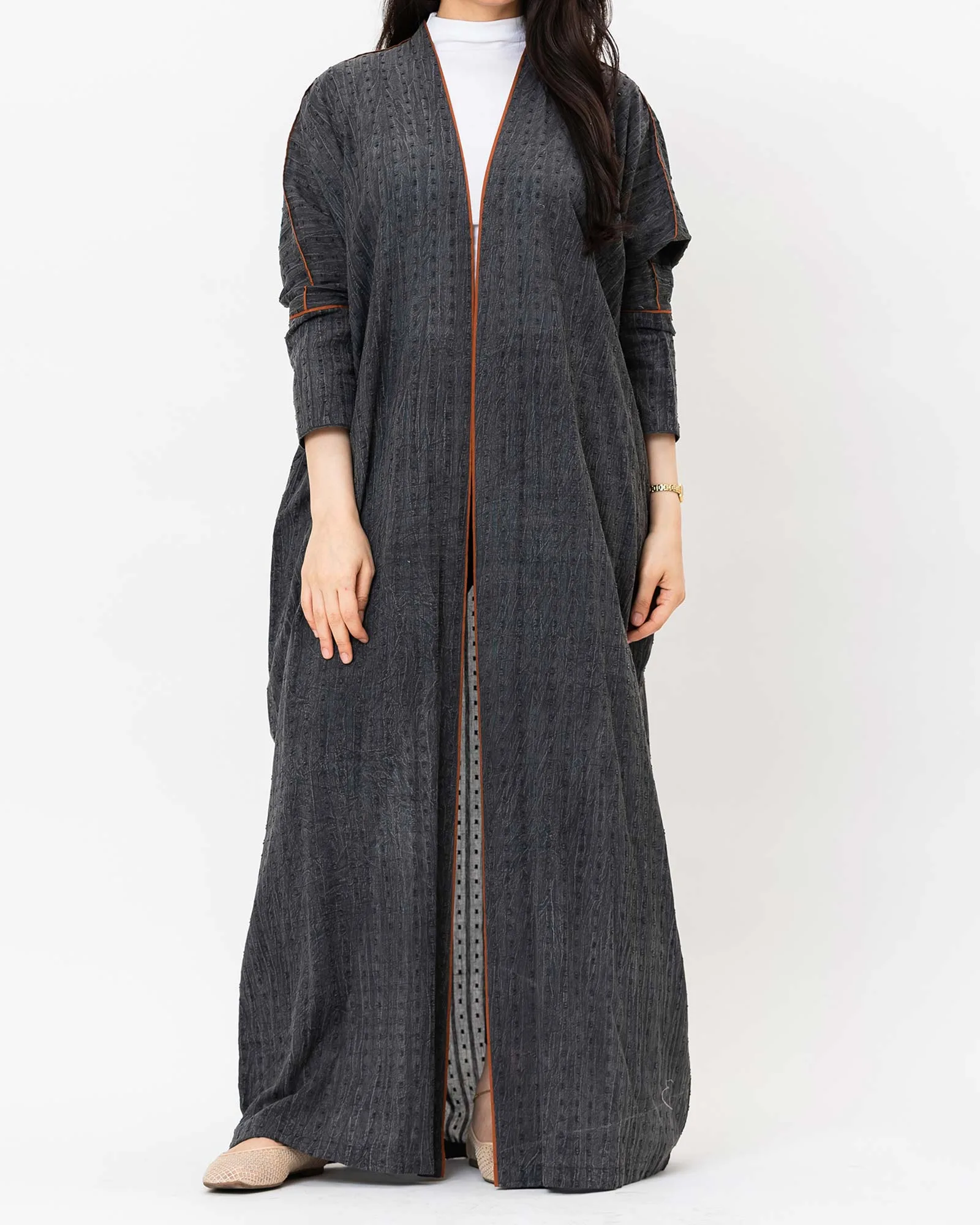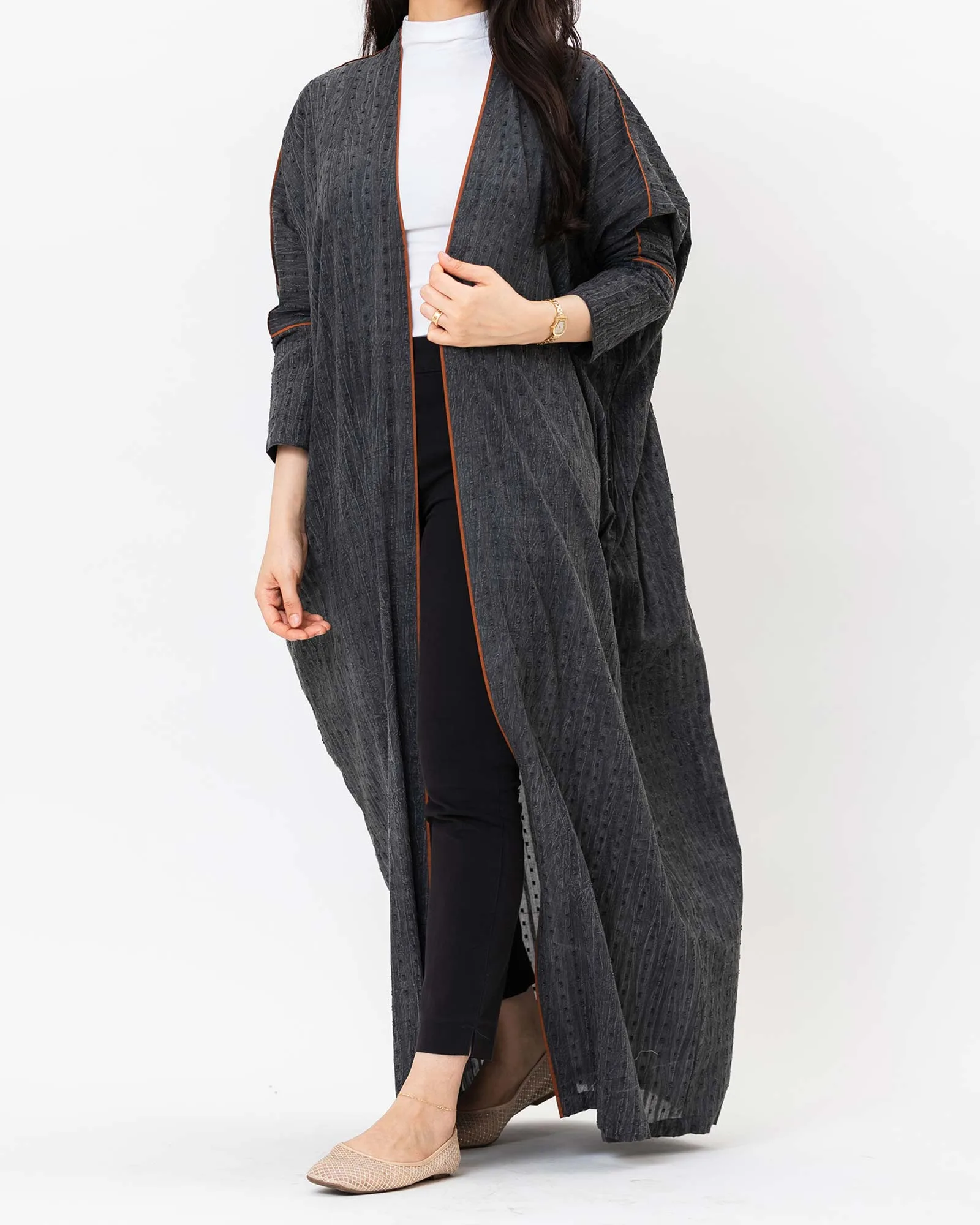 Stay effortlessly chic with Gelato, a half-bisht cotton abaya designed in a relaxed fit with vibrant piping details. Perfect for casual daily wear and easy styling.