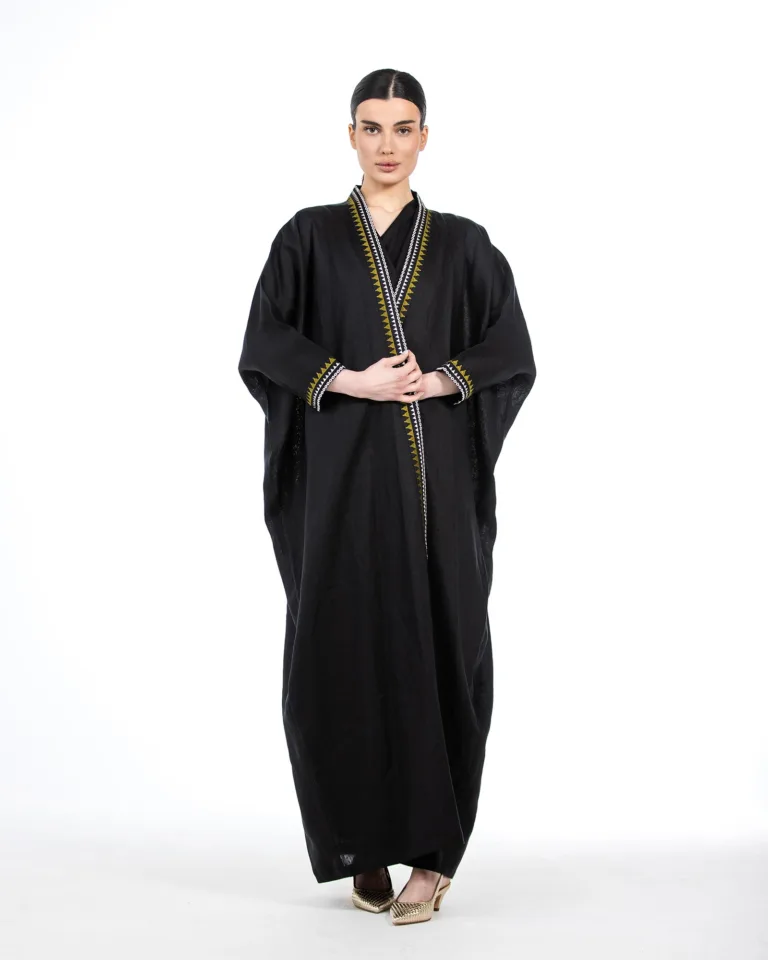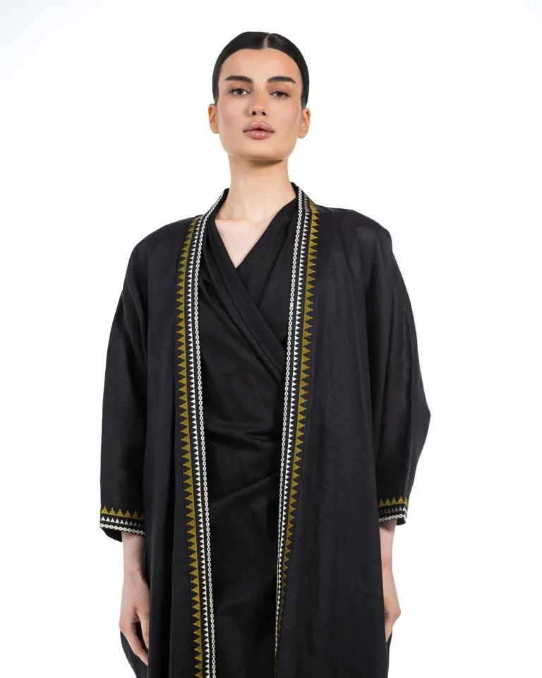 This abaya is made from woven linen fabric with striped weave and is perfect for formal and festive events. It features a relaxed fit bisht cut and a flared silhouette, making it a timeless classic.
