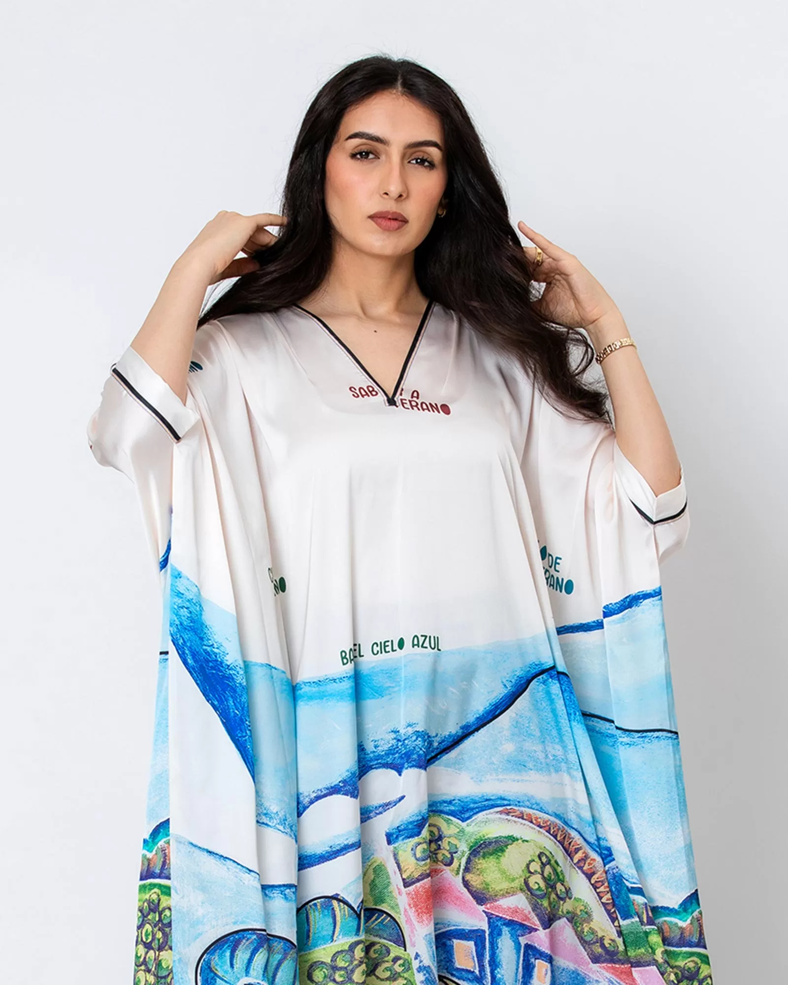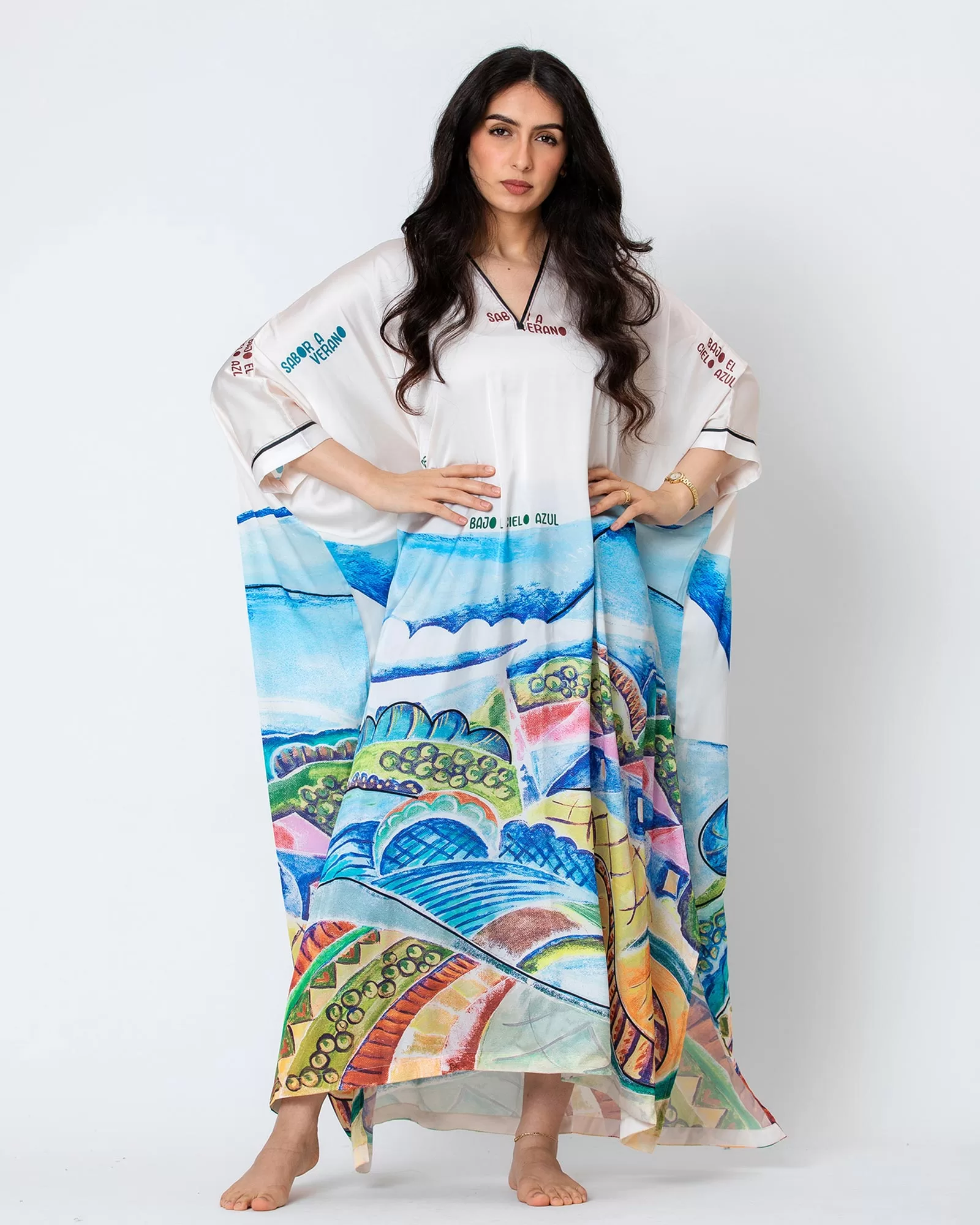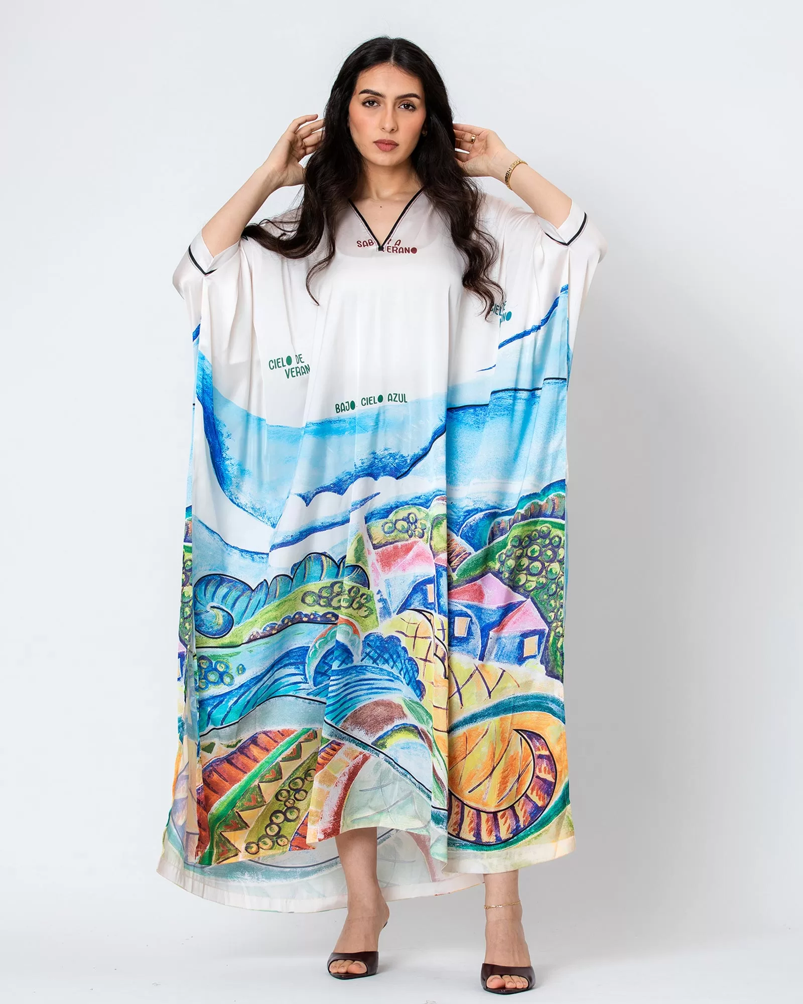 • Meadow brings art to life with its stunning watercolor-inspired print on soft, breathable silk fabric. Designed in an oversized kaftan silhouette, it offers a relaxed fit perfect for beachside lounging or vacation layering. A flattering V neckline, three-quarter sleeves, and side slits add effortless movement and a breezy charm to the design.